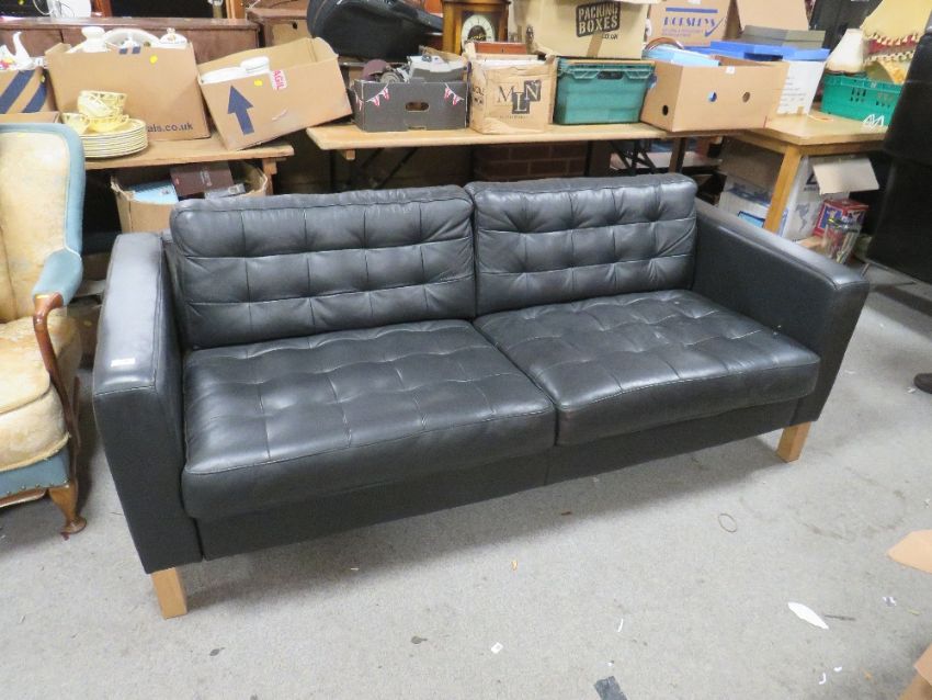 A MODERN BLACK LEATHER BUTTONED SETTEE W-188 CM