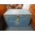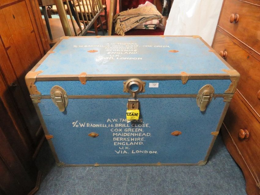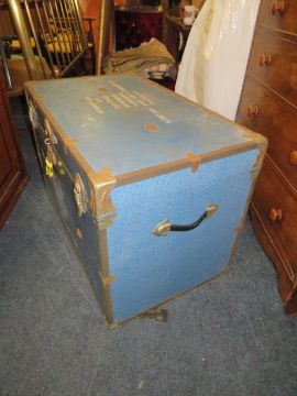 A VINTAGE BLUE PACKING TRUNK - BANDED H-61 W-88 CM