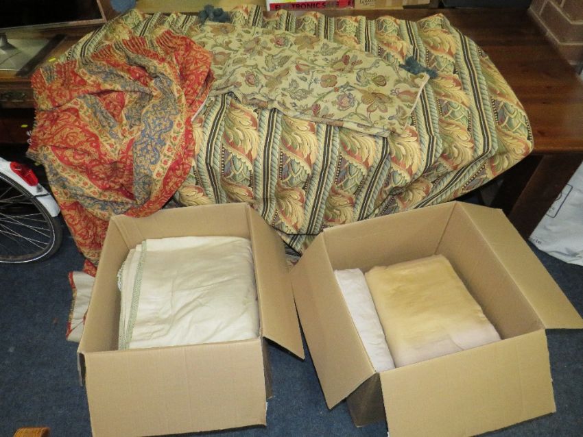 A QUANTITY OF LINED CURTAINS TO INCLUDE TAPESTRY STYLE EXAMPLES - TWO BOXES