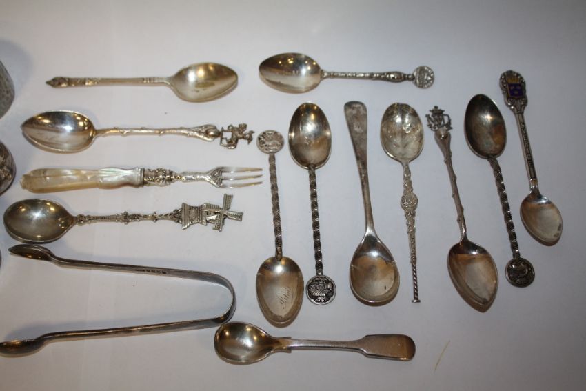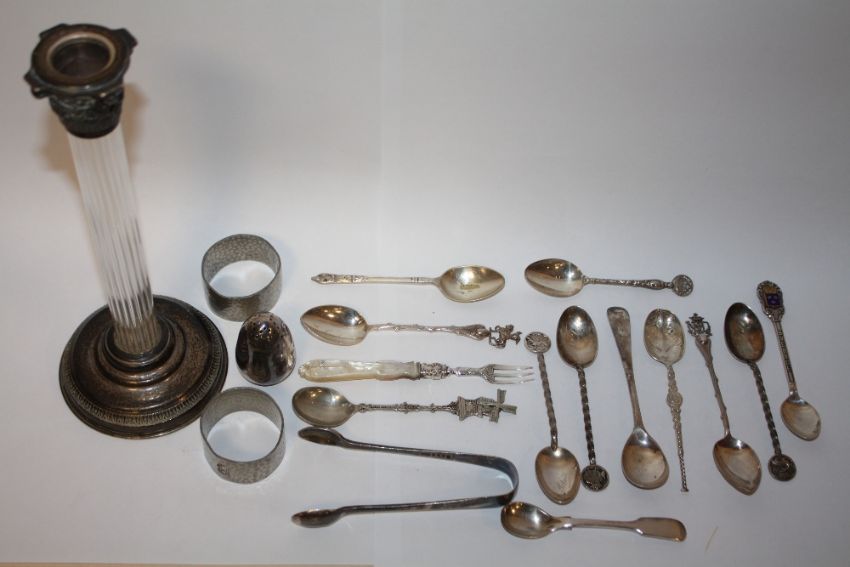 A BAG OF COLLECTABLES TO INCLUDE PEWTER NAPKIN RINGS, CANDLESTICK ETC.