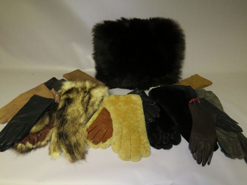 A QUANTITY OF VINTAGE GLOVES TO INC THREE PAIRS OF 1930s LADIES DRIVING GLOVES TOGETHER WITH A VINTAGE FUR MUFF (13)