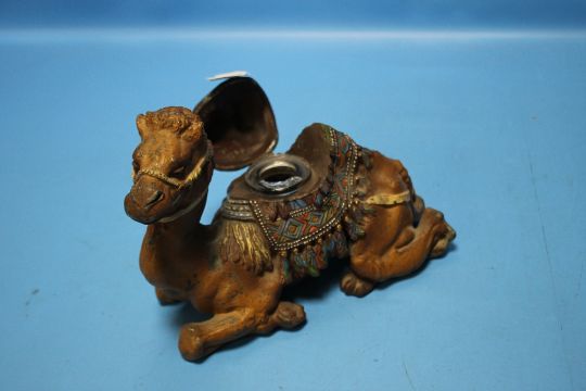 A COLD PAINTED SPELTER CAMEL INKWELL Condition Report : There are a few areas of loss and a crack under the neck