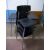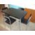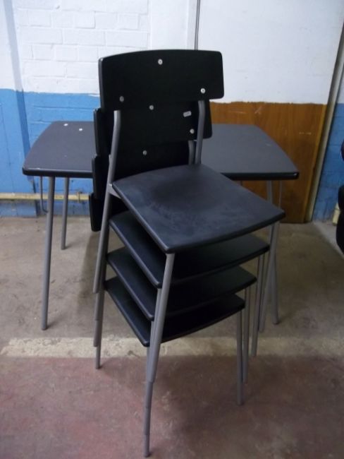 A BLACK DINING TABLE AND FOUR STACKABLE CHAIRS
