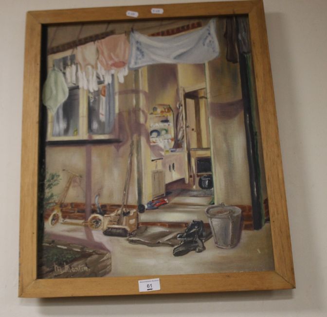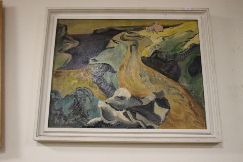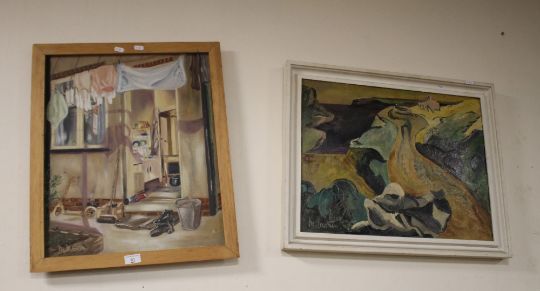 MARJORIE MARTIN - AN ABSTRACT OIL PAINTING ON BOARD AND ANOTHER ON CANVAS OF A BACK DOOR