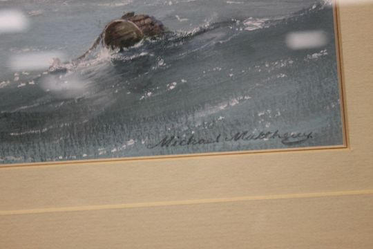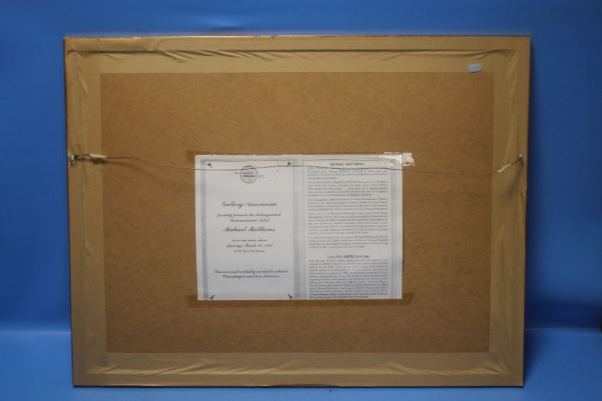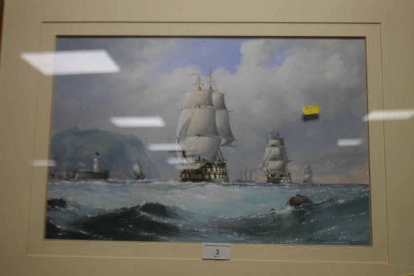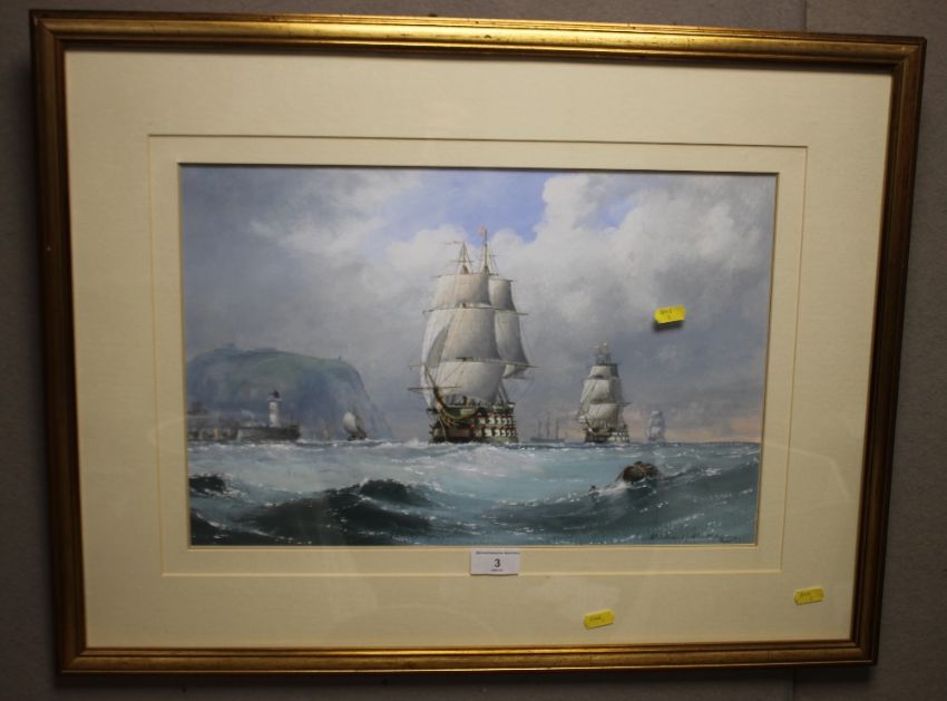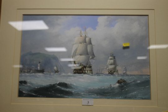 MICHAEL MATTHEWS GOUACHE AND WATERCOLOUR PAINTING OF A SEASCAPE DEPICTING SEVERAL SHIPS UNDER SAIL, SIGNED LOWER RIGHT