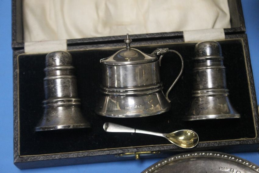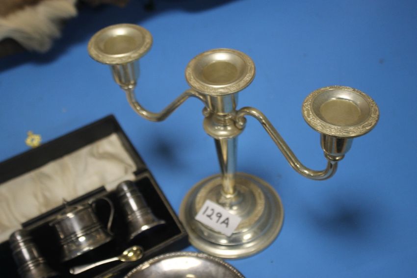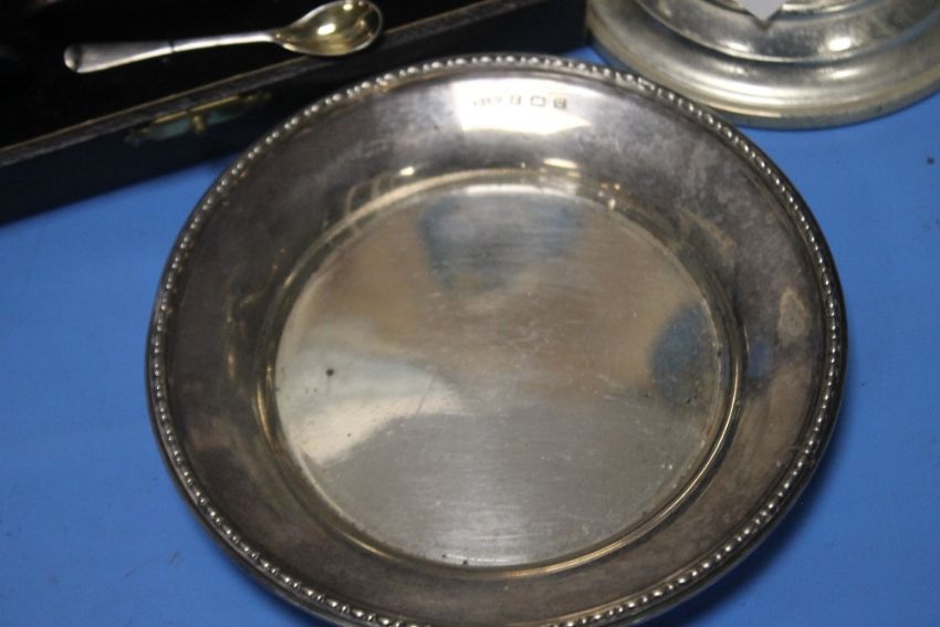 A HALLMARKED SILVER SMALL DISH, HALLMARKED CONDIMENT SET IN CASE AND A PLATED CANDLE HOLDER