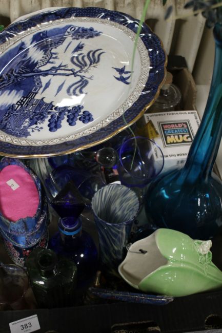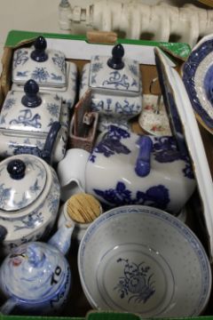 TWO BOXES OF CHINA AND GLASS TO INCLUDE BLUE & WHITE STORAGE JARS, CHEESE DISH, A PAIR OF LAWLEYS DINNER PLATES, VASES ETC.