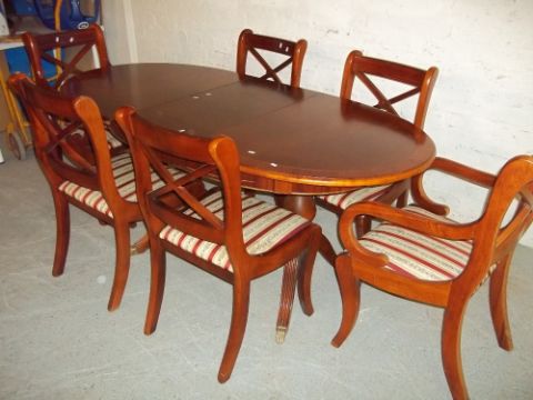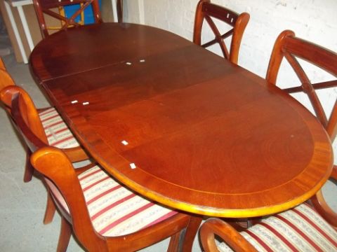 AN EXTENDING INLAID DINING SET TABLE AND SIX CHAIRS TO INCLUDE TWO CARVERS