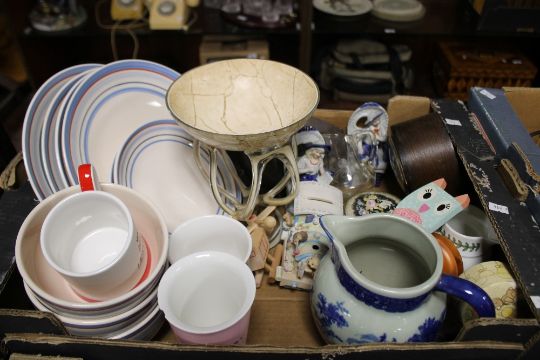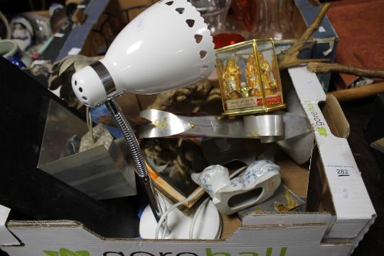 A BOX OF ORNAMENTS TO INCLUDE MIRRORS AND LAMPS