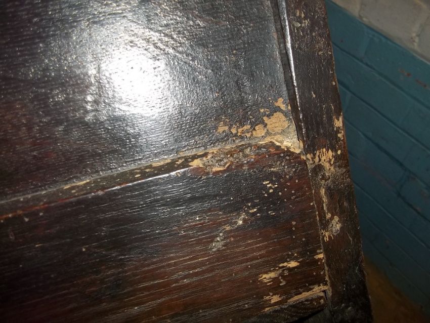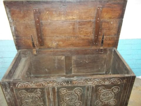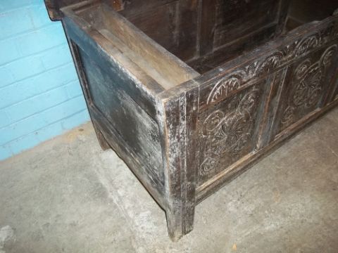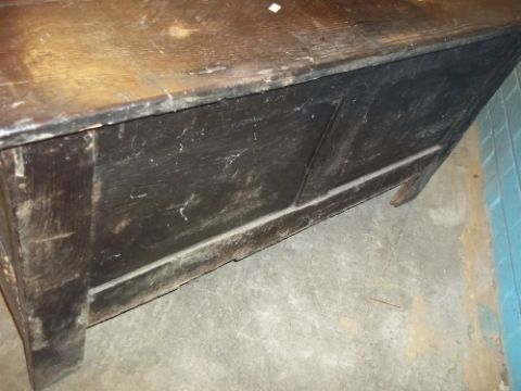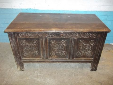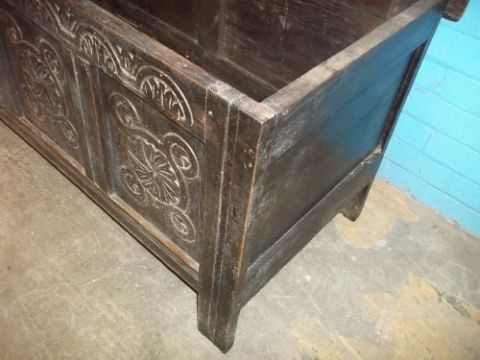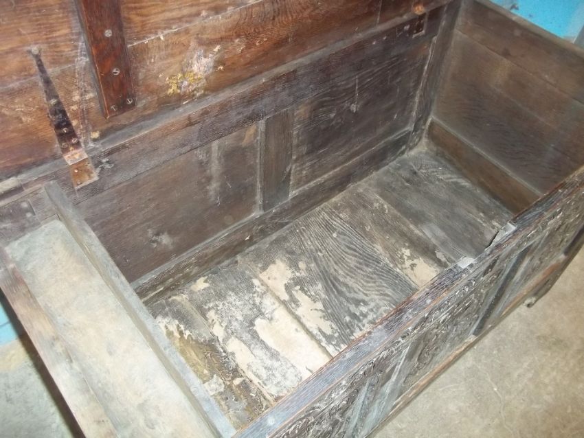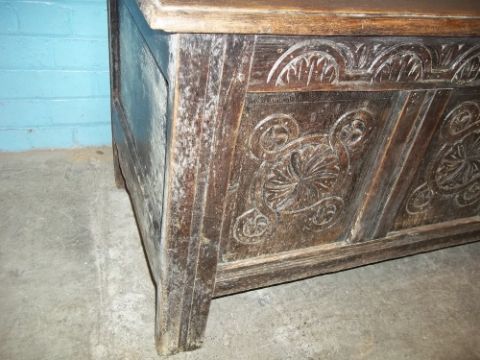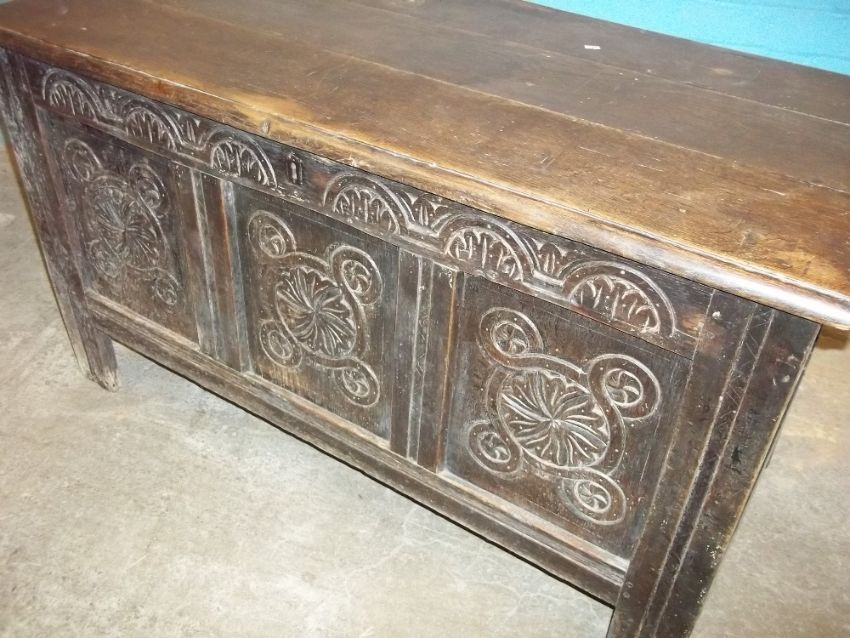 AN ANTIQUE OAK BLANKET CHEST COFFER WITH CARVED DETAIL, L 124 cm, H 70 cm, D 61 cm Condition report: Various areas of damage, water marks to the front