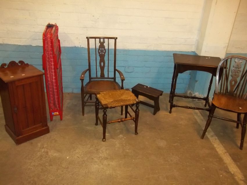 THREE CHAIRS, A STOOL, AN ANTIQUE OAK SIDE TABLE AND AN ANTIQUE BEDSIDE CABINET