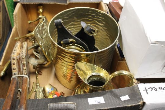 A COLLECTION OF BRASSWARE TO INCLUDE TRIVET, HORSE BRASSES, CANDLESTICKS, WAR PISTOLS AND BELLOWS