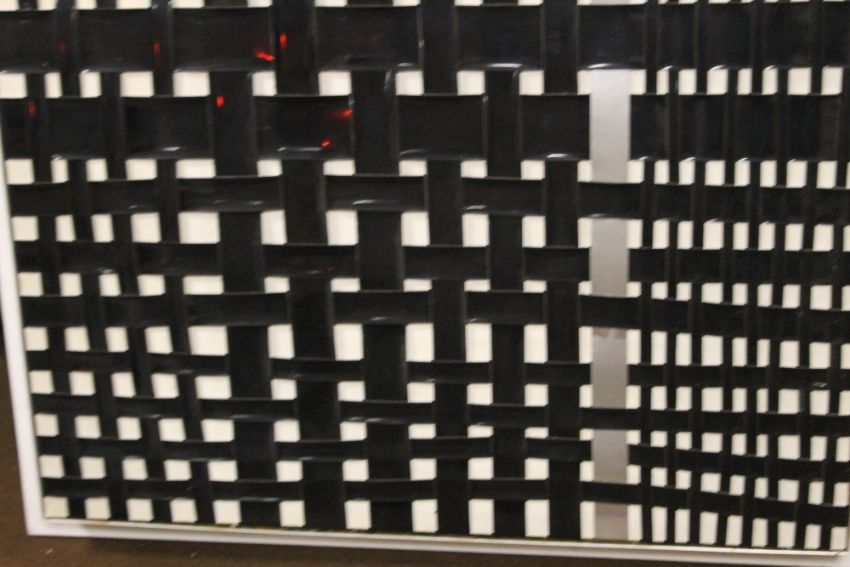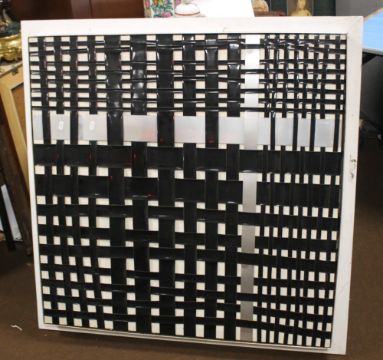 A MODERN ARTWORK ENTITLED "BLACK ON WHITE", COMPRISING LEATHER LATTICE WORK BY M. MARTIN 1970, 101 X 101 CM