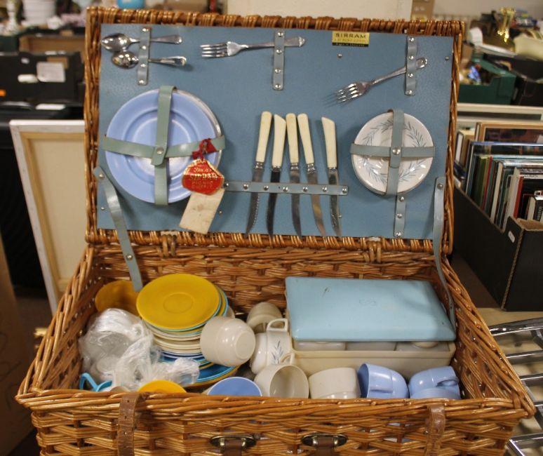 A PICNIC BASKET / HAMPER WITH CONTENTS, SIRRAM