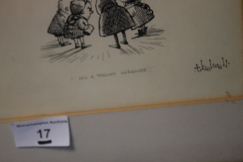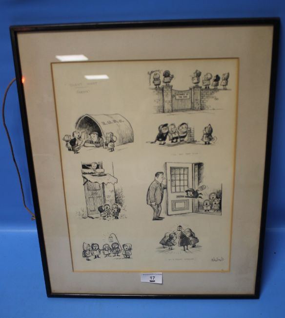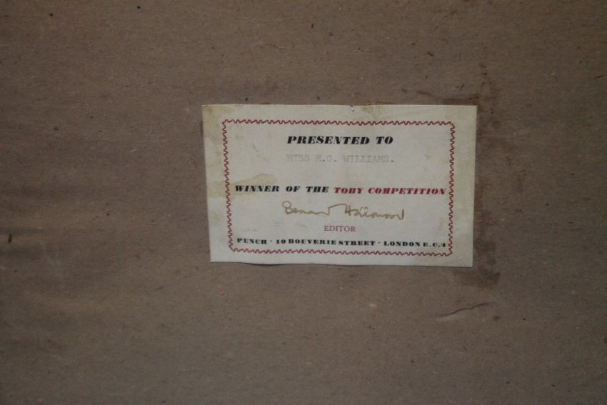 A FRAMED THELWELL PEN & INK SET OF DRAWINGS WITH LABEL ON BACK "PRESENTED TO MISS E. G. WILLIAMS, WINNER OF THE TOBY COMPETITION" SIGNED BY BERNARD HOLLOWOOD EDITOR PUNCH 10 BOUVERIE STREET, LONDON, E. C. 4