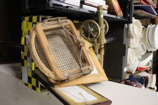 A HEAVY BRASS CANNON AND OTHER BRASS ORNAMENTS, A LARGE OWL, THREE PICTURES AND VINTAGE DUNLOP TENNIS RAQUET
