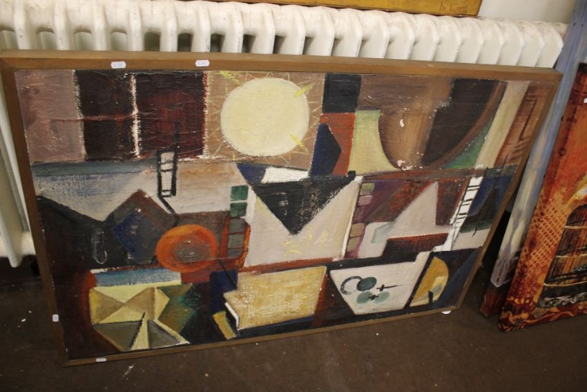 ABSTRACT ART ON WOOD TITLED "SPANISH VILLAGE", SIGNED MARJORIE MARTIN