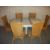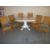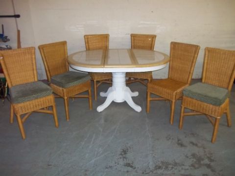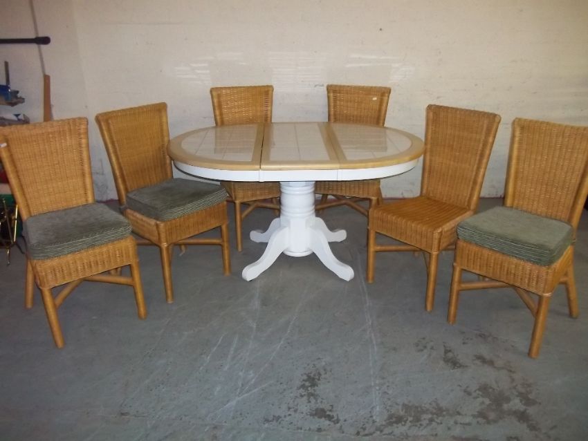 AN EXTENDING TILE TOPPED ROUND DINING SET TABLE AND SIX WICKER CHAIRS