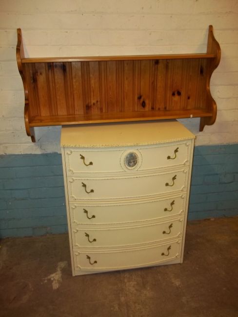 A LOUIS STYLE BOW FRONTED CHEST OF FIVE DRAWERS AND A PINE PLATE RACK