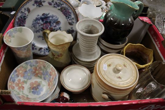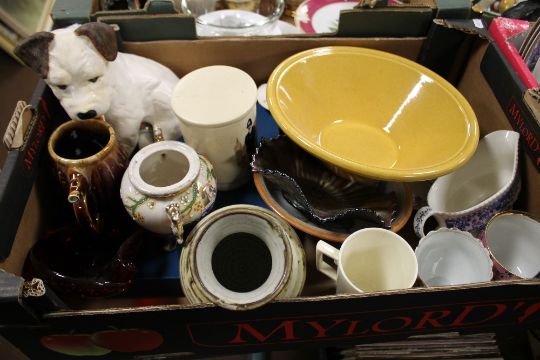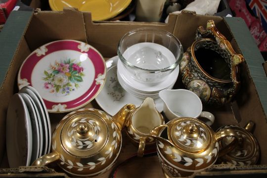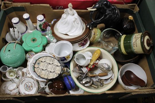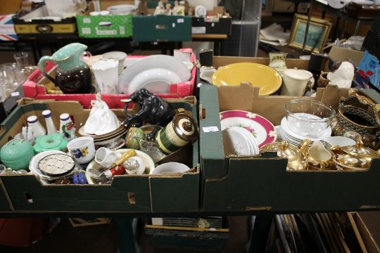 FOUR TRAYS OF CERAMICS AND GLASSWARE TO INCLUDE FOUR PIECE SADLER TEA SET, COALPORT 'SAMANTHA' FIGURINE, WOODEN ELEPHANT ETC.