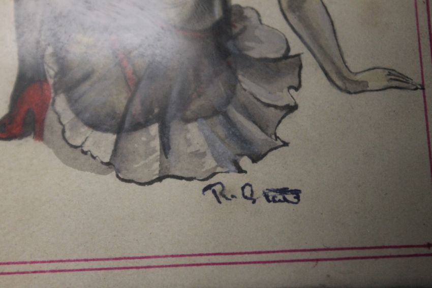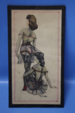 A SMALL FRAMED WATERCOLOUR OF SCANTILY CLAD LADIES 23 X 13 CM