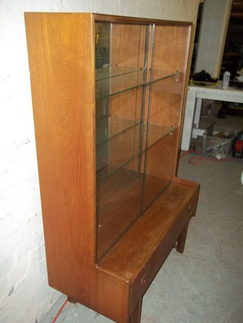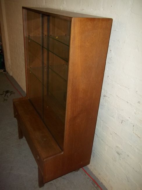 A RETRO TEAK SMALL DISPLAY MIRROR BACKED UNIT WITH GLASS SHELVES AND SLIDING GLASS DOORS MADE BY TURNINGE PRODUCTS