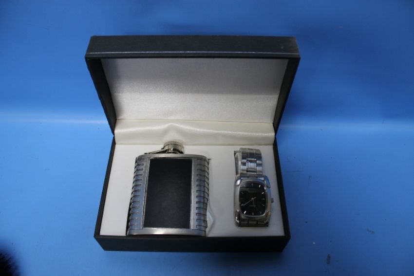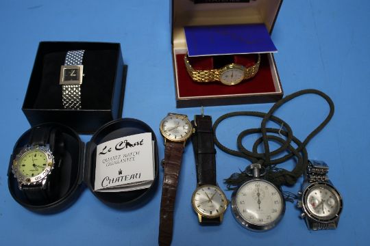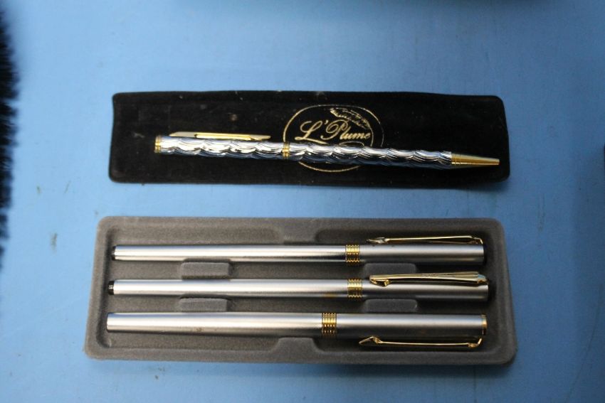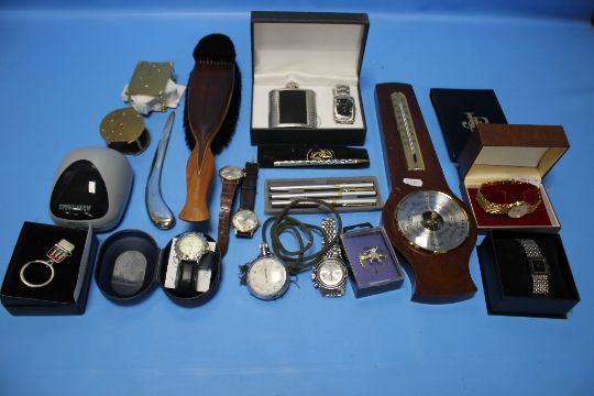 A BOX OF ASSORTED PENS, WRIST WATCHES ETC.