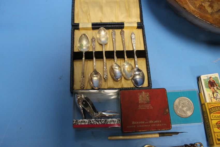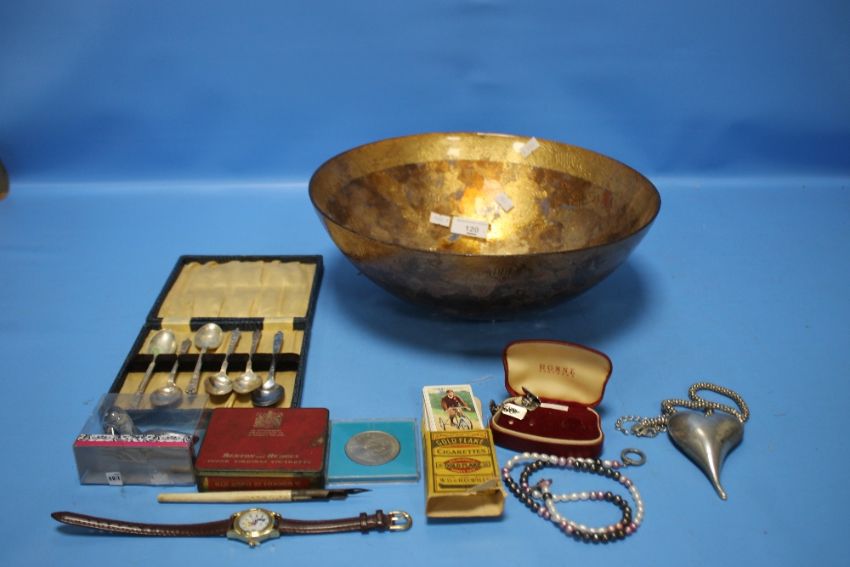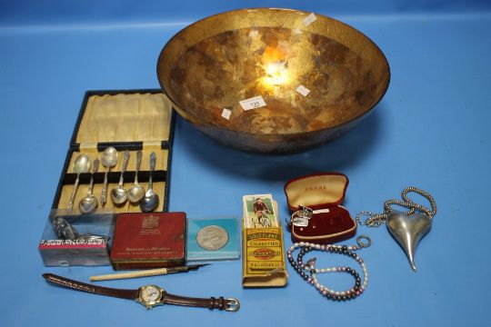 A BOWL OF COLLECTABLES AND JEWELLERY