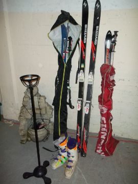 THREE SETS OF SKIS AND A GARDEN WATER FEATURE