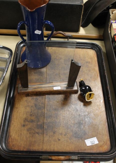 A VINTAGE WOODEN BUTLER'S TRAY, A THREE HANDLED CERAMIC VASE AND A VINTAGE PICTURE FRAME