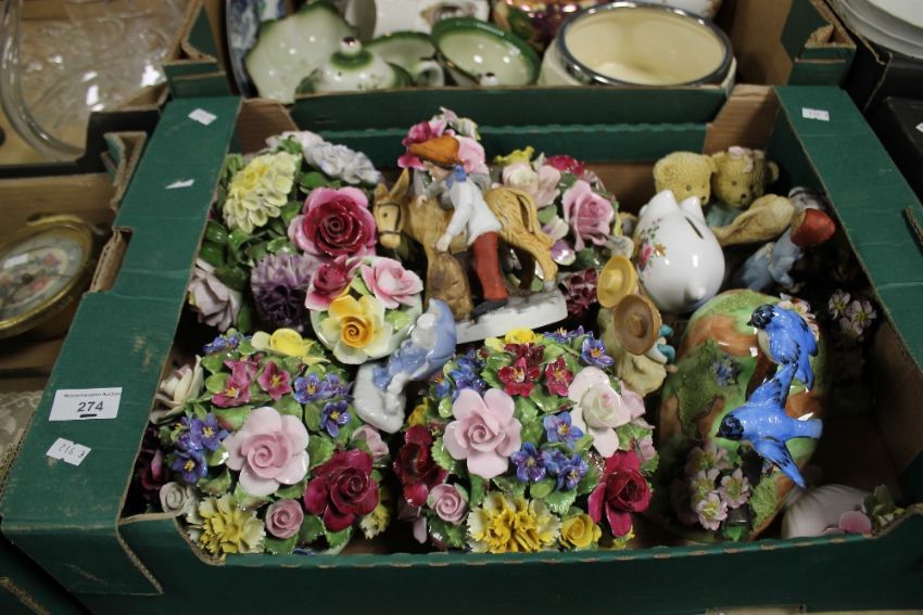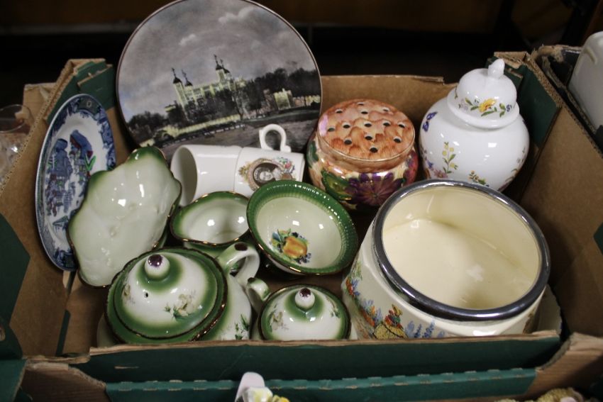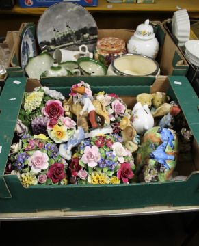 TWO BOXES OF CERAMICS TO INCLUDE A QUANTITY OF FLOWER ORNAMENTS AND AN AYNSLEY TEMPLE JAR