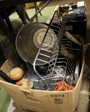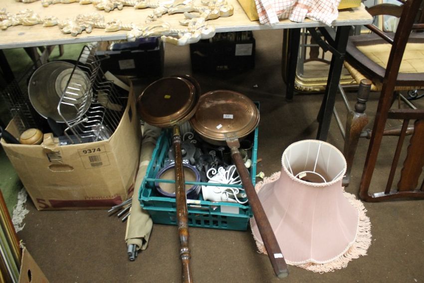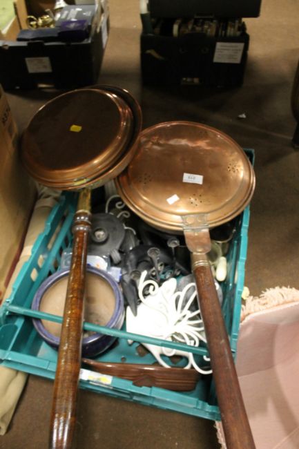 TWO BOXES OF SUNDRIES TO INCLUDE TWO COPPER BEDWARMERS, TWO SINK TIDIES, FLATWARE, COFFEE POT, KITCHENWARE, BOOKS, PINK STANDARD LAMPSHADES ETC.