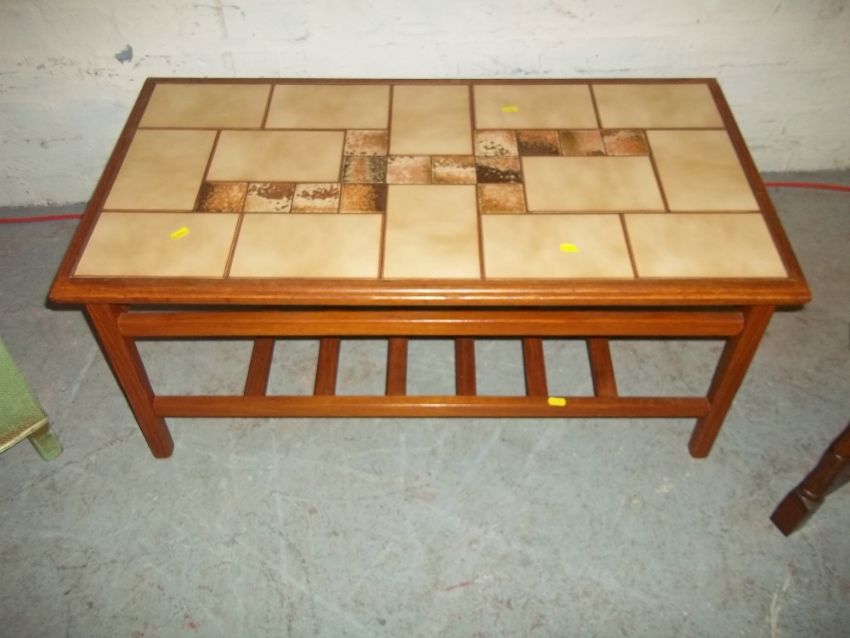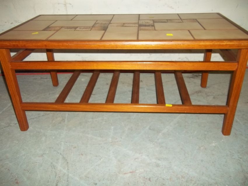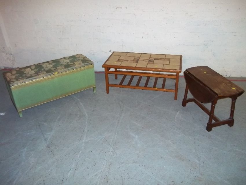 A RETRO TEAK TILE TOPPED COFFEE TABLE WITH STRETCHER SHELF, AN OAK TWIST TOP DROP LEAF SIDE TABLE, A LLOYD LOOM STYLE BLANKET CHEST (3)
