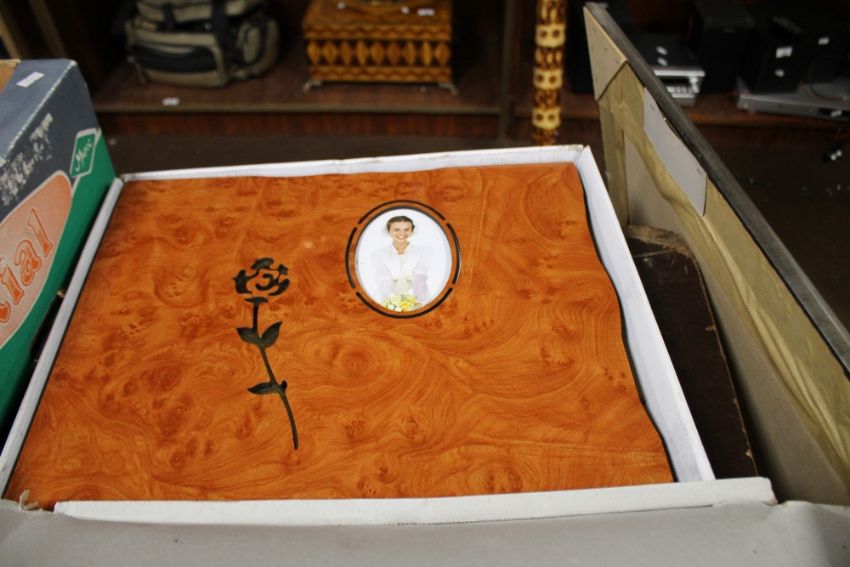 A BOX OF COLLECTABLES TO INCLUDE WALKING STICKS, MODEL LOCOMOTIVES, A WEDDING ALBUM ETC.