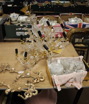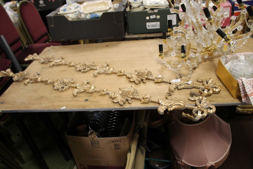 A PAIR OF GILT WALL ART TOGETHER WITH AN EIGHT ARM CEILING LIGHT FITMENT WITH BULBS