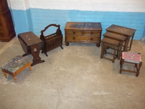 SIX ITEMS - AN OAK TWIST TOP DROP LEAF TABLE, AN OAK NEST OF THREE TABLES, TWO VINTAGE STOOLS, AN OAK MAGAZINE RACK AND A MEDIA UNIT (6)
