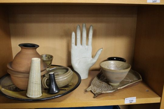 A QUANTITY OF STUDIO POTTERY TO INCLUDE A SCULPTURE OF A HAND