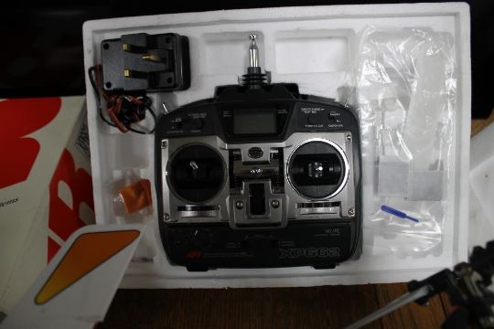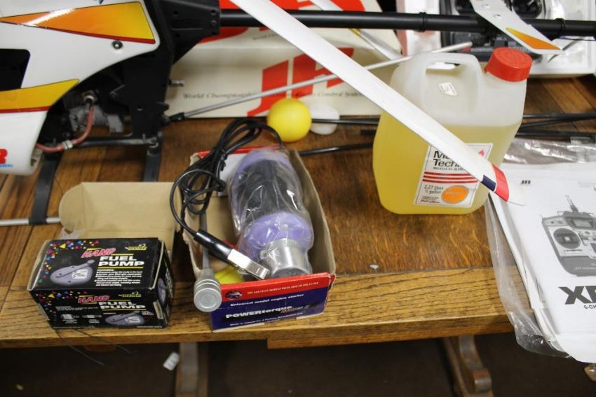 A VINTAGE VENTURE CP REMOTE CONTROL HELICOPTER WITH INSTRUCTIONS, SIX CHANNEL RADIO, FUEL AND POWER TORQUE STARTER