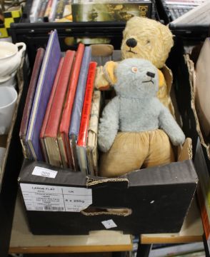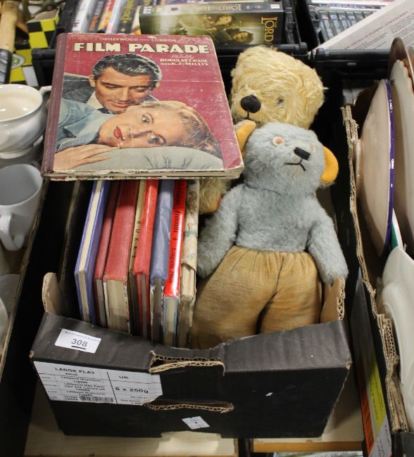 A VINTAGE JOINTED CHAD VALLEY TEDDY BEAR, H 35 CM AND ANOTHER CHAD VALLEY SOFT TOY TOGETHER WITH 9 VINTAGE FILM, TV AND CHILDREN'S ANNUALS