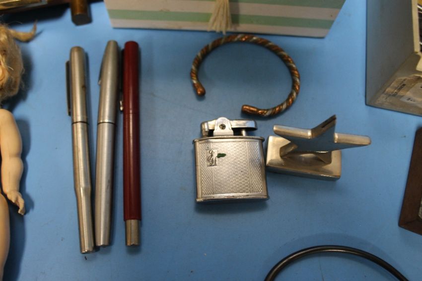 A QUANTITY OF COLLECTABLES TO INCLUDE PENS, CIGARETTE LIGHTERS, DOLLS AND A BAROMETER
