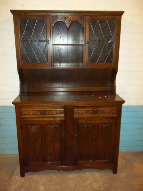 AN OAK DISPLAY WALL UNIT WITH LEADED GLASS AND LINENFOLD DESIGN