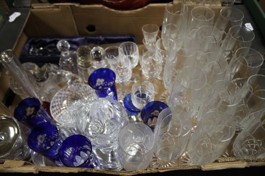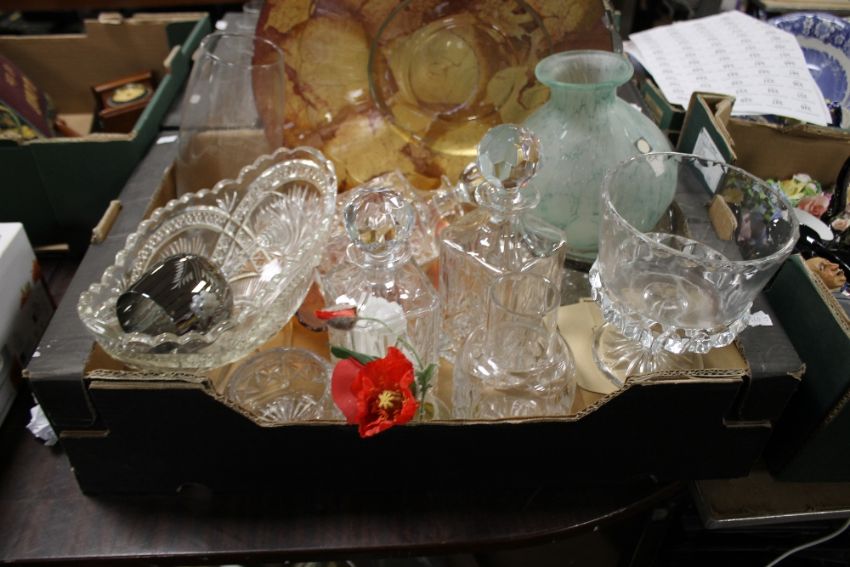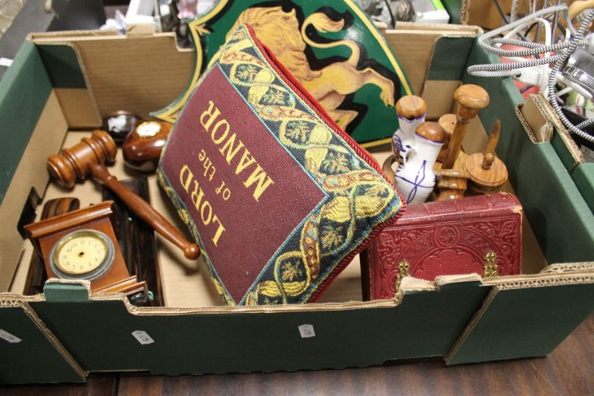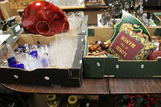 THREE TRAYS OF SUNDRIES TO INCLUDE AUCTIONEER'S GAVEL, WOODEN CLOCK, BOXED CAKE KNIFE, GLASSWARE TO INCLUDE CUT GLASS, DECANTERS ETC.