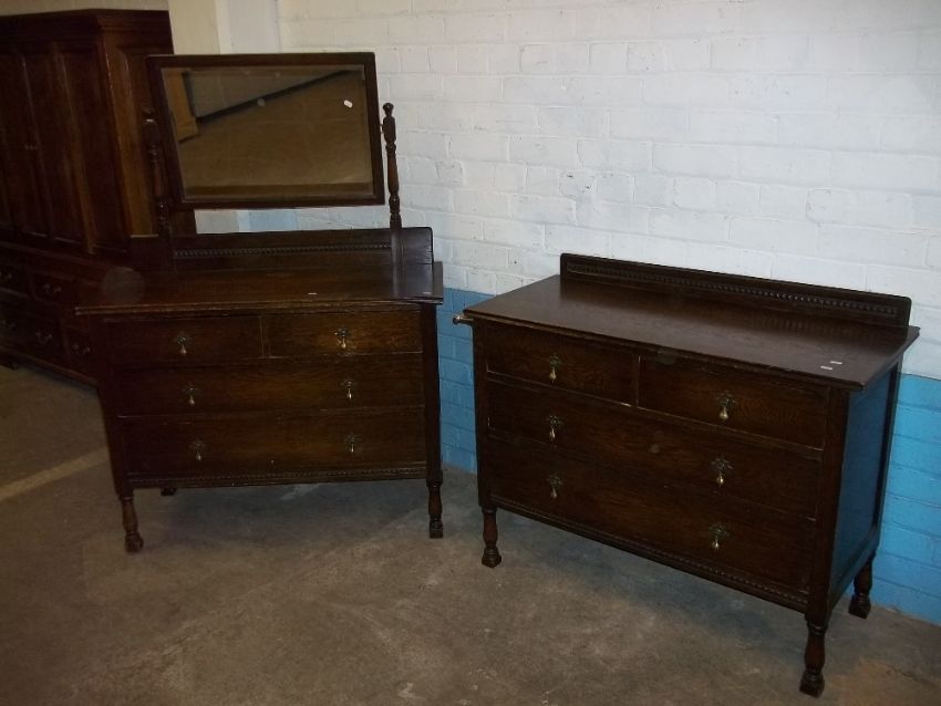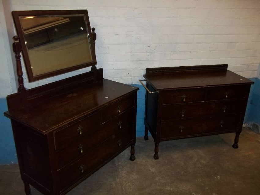 AN EARLY 1900S OAK DRESSING TABLE WITH A MATCHING CHEST OF DRAWERS