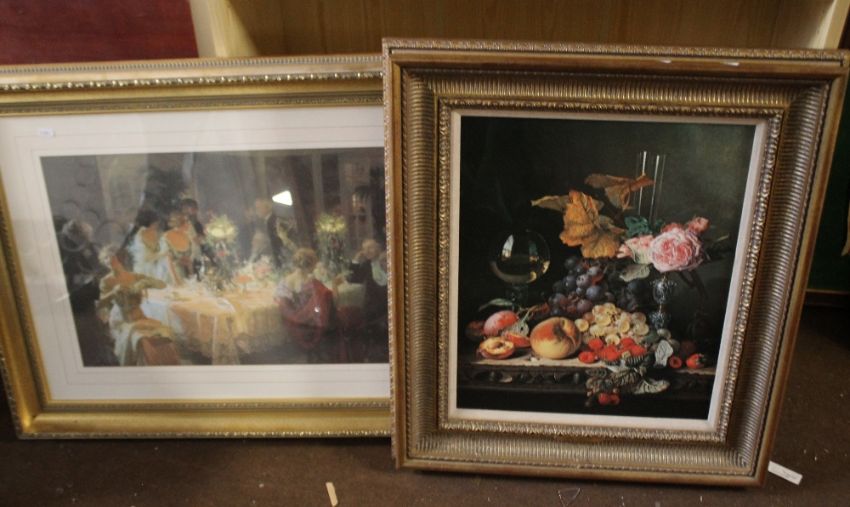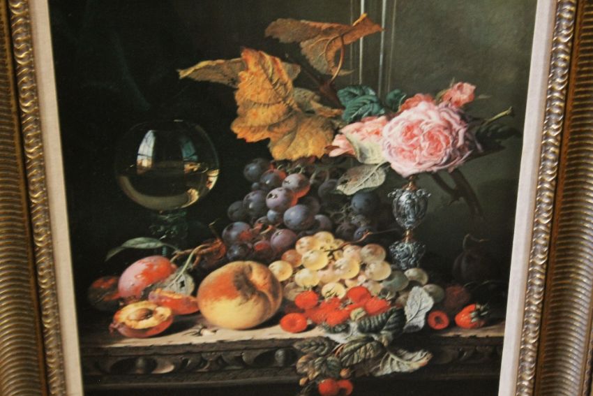 A STILL LIFE OIL ON CANVAS TOGETHER WITH A FRAMED AND GLAZED PRINT