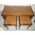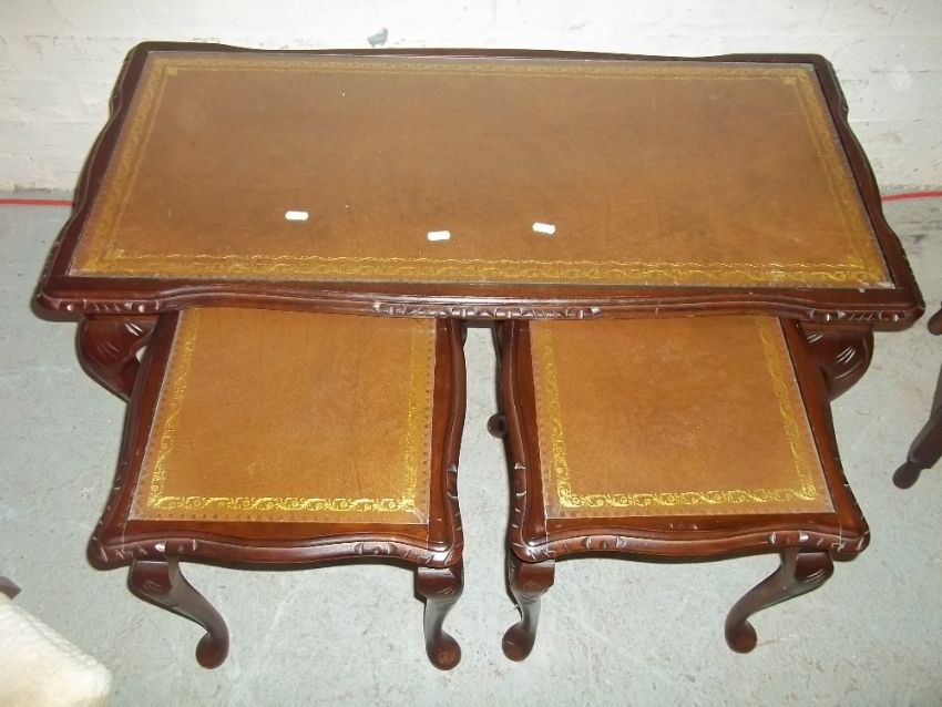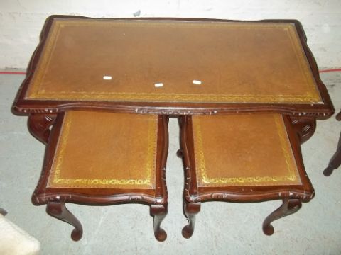 A LEATHER INLAID NEST OF TABLES COMPRISING COFFEE TABLES WITH TWO MATCHING SIDE TABLES, A SMALL HANGING WOTNOT SHELF, A VINTAGE STOOL AND AN ANTIQUE OAK SIDE TABLE WITH BARLEY TWIST LEGS