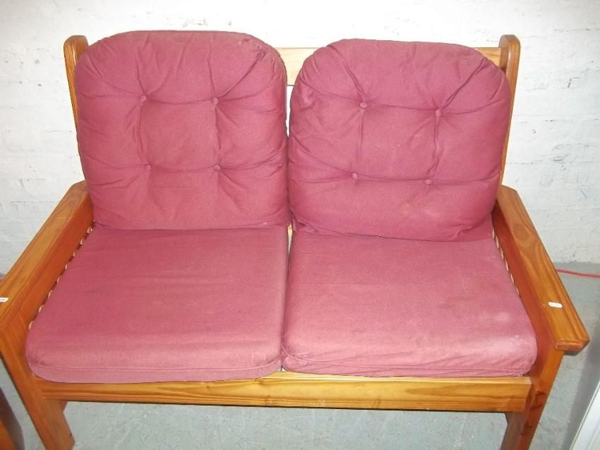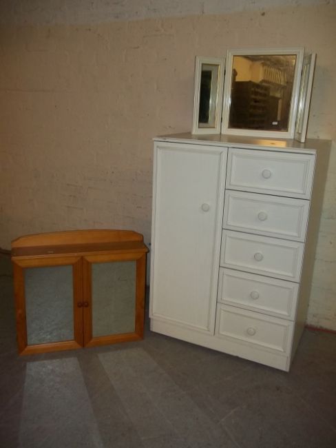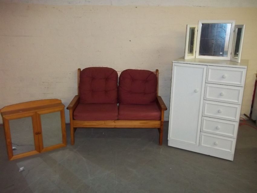 A MODERN TALL BOY WARDROBE, A MODERN TRIPLE MIRROR, A PINE WALL CABINET AND A SOLID PINE TWO SEATER SOFA (4)