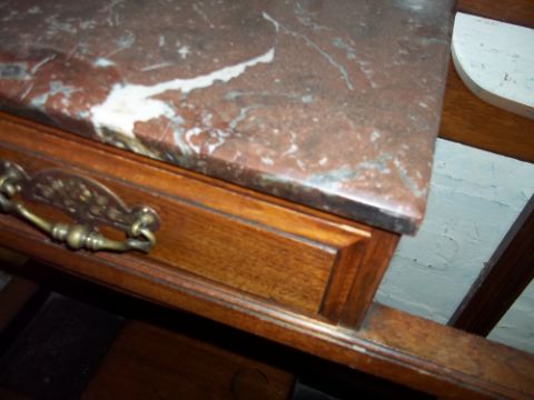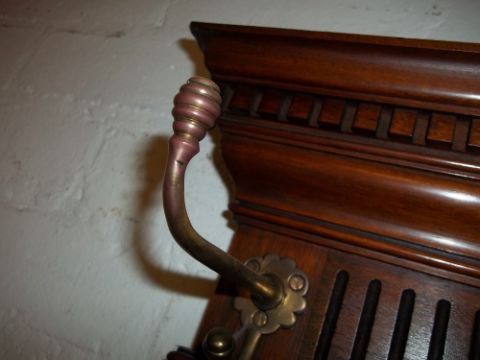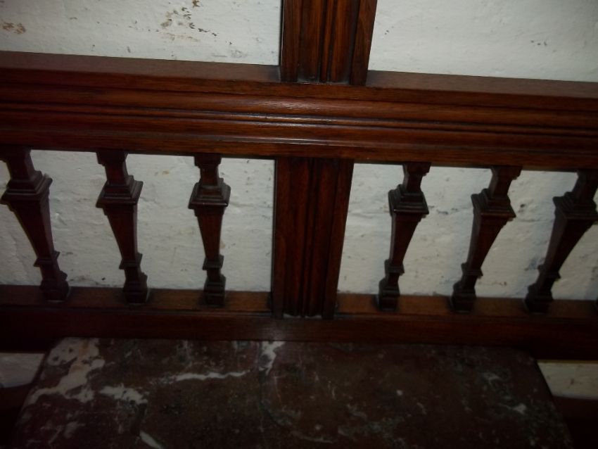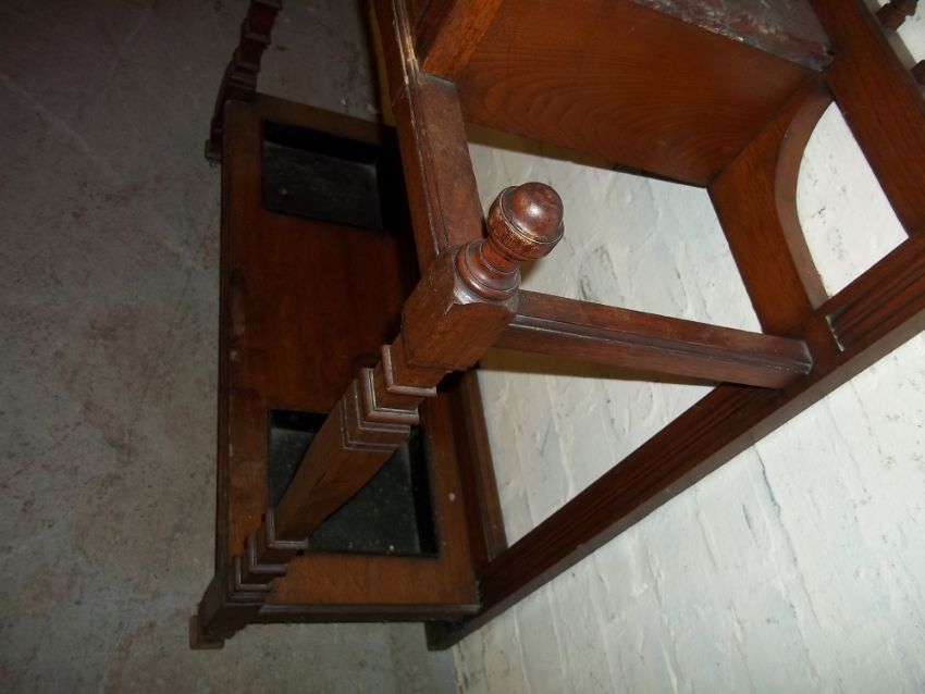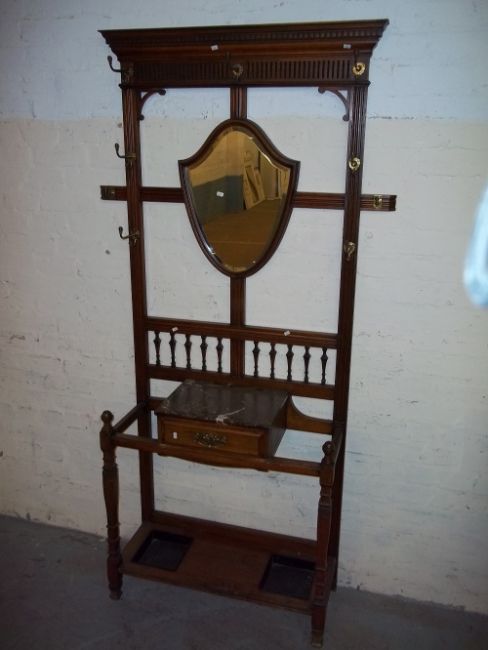 AN EDWARDIAN HALL COAT STAND WITH MARBLE SHELF AND BEVELL EDGED SHIELD MIRROR, W 107 cm, D 34 cm, H 206 cm Cond Report:  No losses or damage, no repairs that can be seen, no visible woodworm