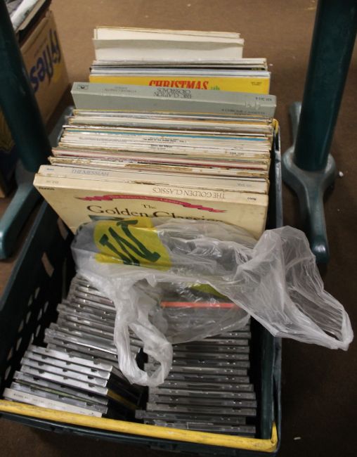 A TRAY OF CLASSICAL AND POP LP RECORDS, SINGLES AND TAPES, A BAG OF UNSLEEVED SINGLES MAINLY 1960S, AND ABOUT 50 CDS MAINLY POP MUSIC