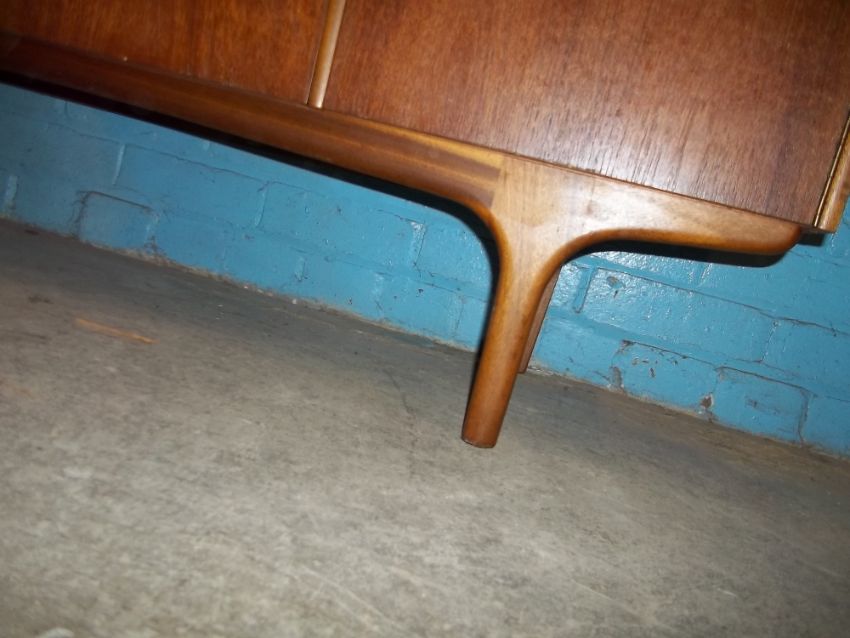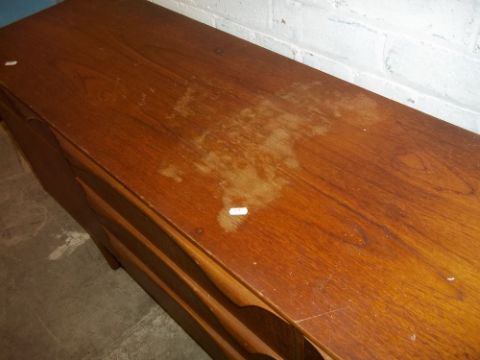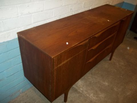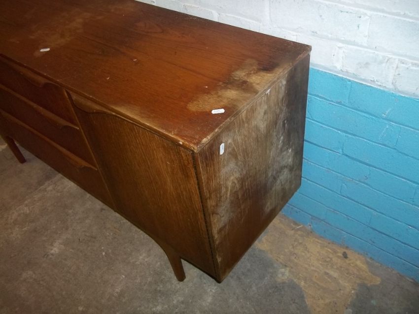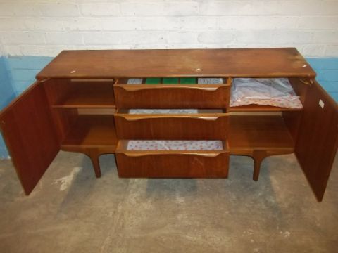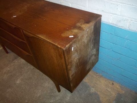 A RETRO TEAK SIDEBOARD IN NEED OF COSMETIC RESTORATION