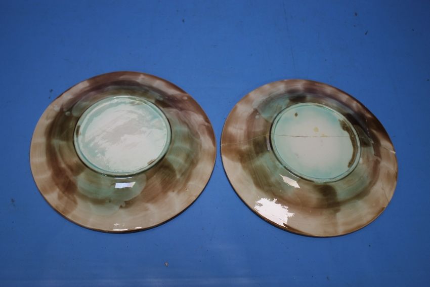 A PAIR OF MAJOLICA PLATES, ONE A/F